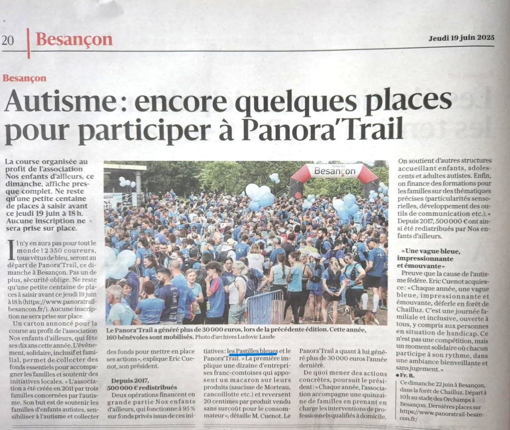 Créée en 2011, l’association « Nos Enfants d’Ailleurs » regroupe des familles ayant un enfant autiste. Nous œuvrons pour apporter du soutien aux familles sur la Franche comté et notamment en permettant aux parents de développer des compétences parentales pour aider leur enfant à grandir avec l’autisme.